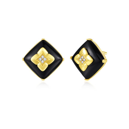 Minimalist Black Onyx Studs – Gold Flower Motif with Center Stone Earrings