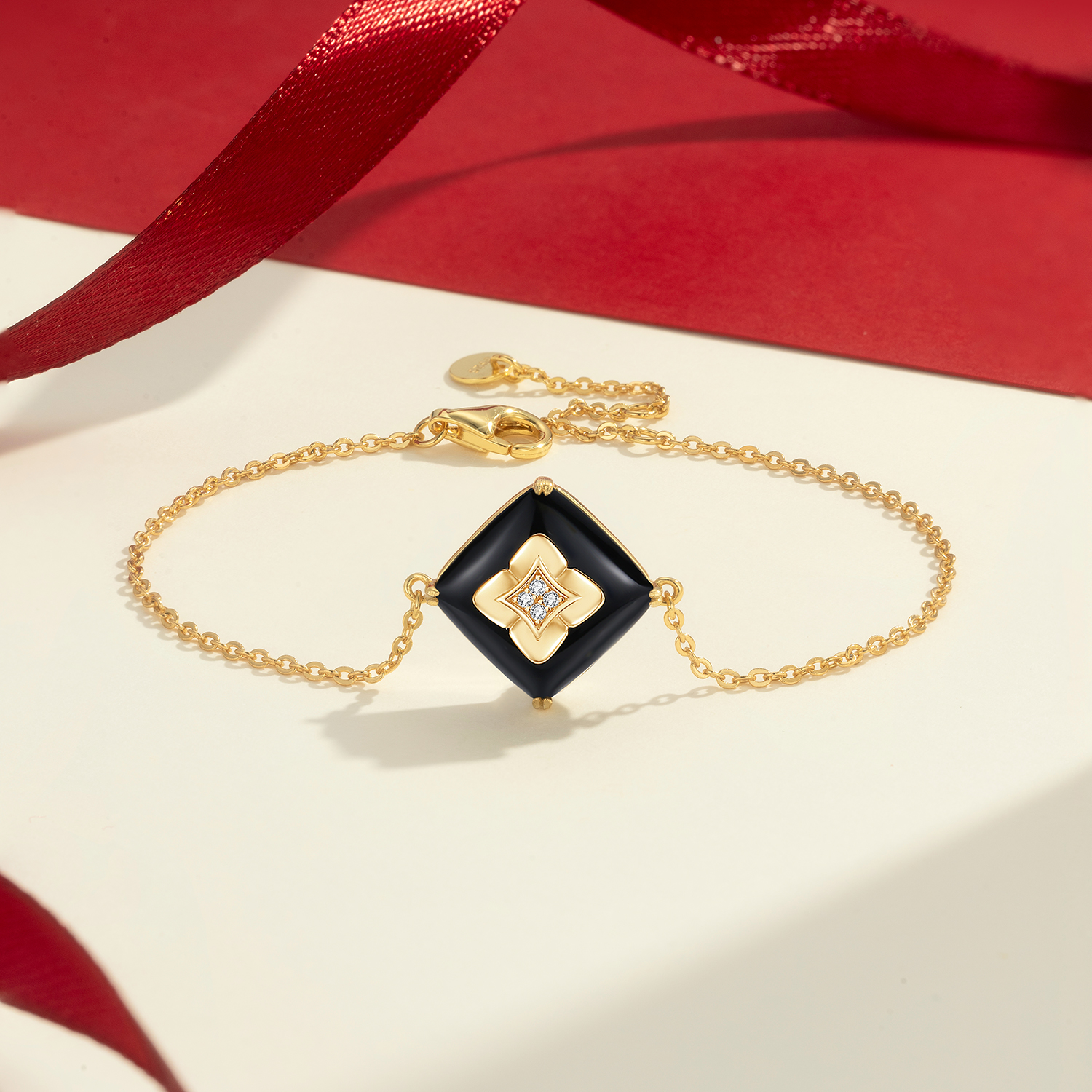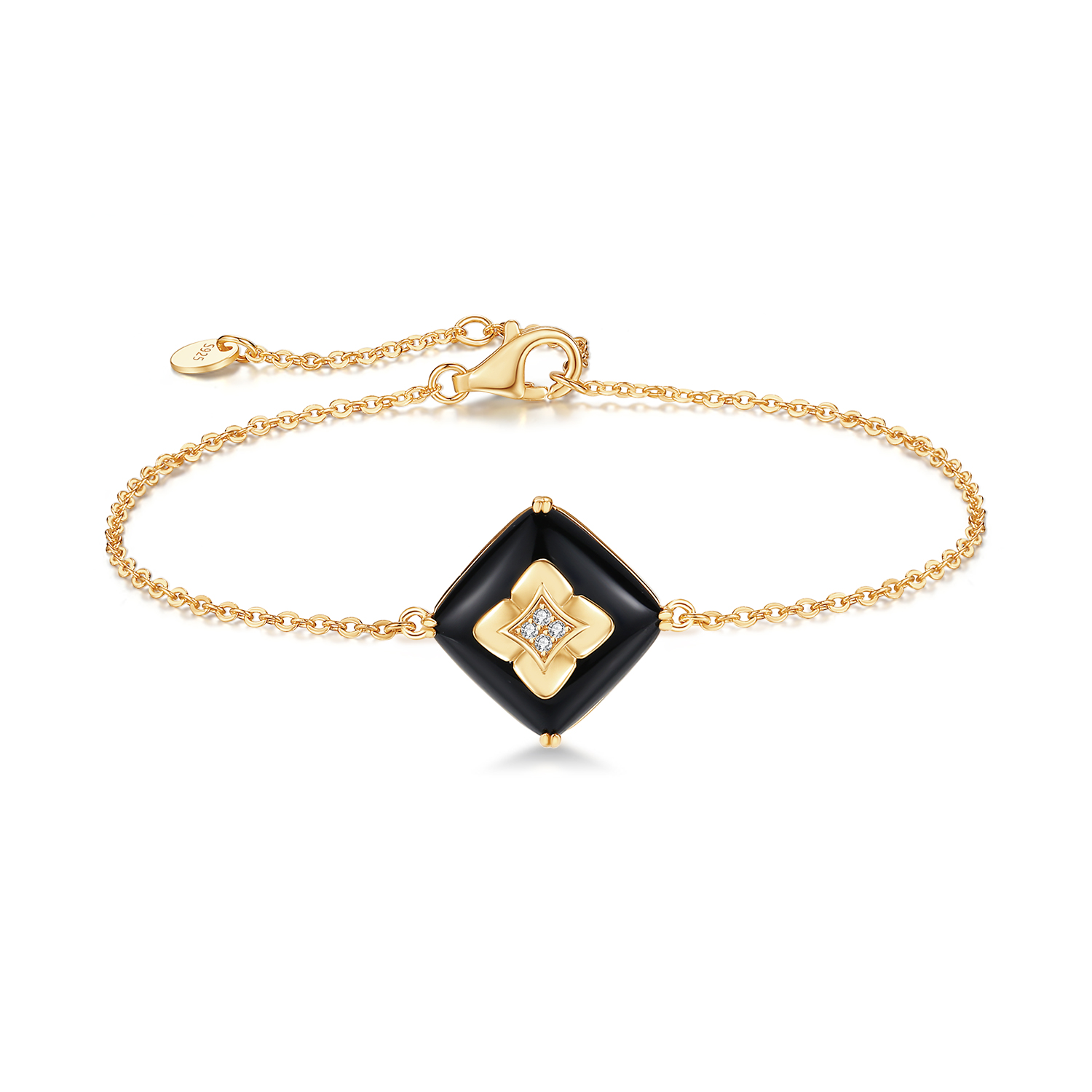 Black Onyx Gold Bracelet – Elegant Clover Pendant with Sparkling Diamond-like Stone Center