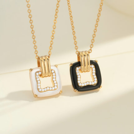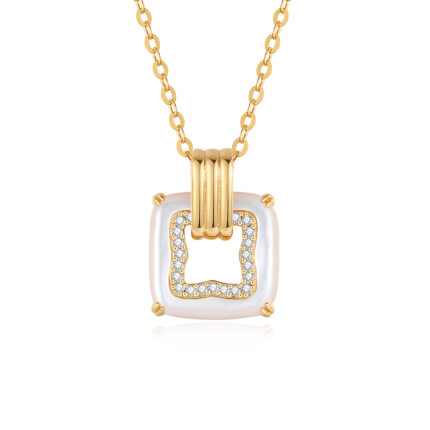 14K Gold Square Pendant Necklace with Mother-of-Pearl & Diamond Border – Elegant Minimalist Jewelry